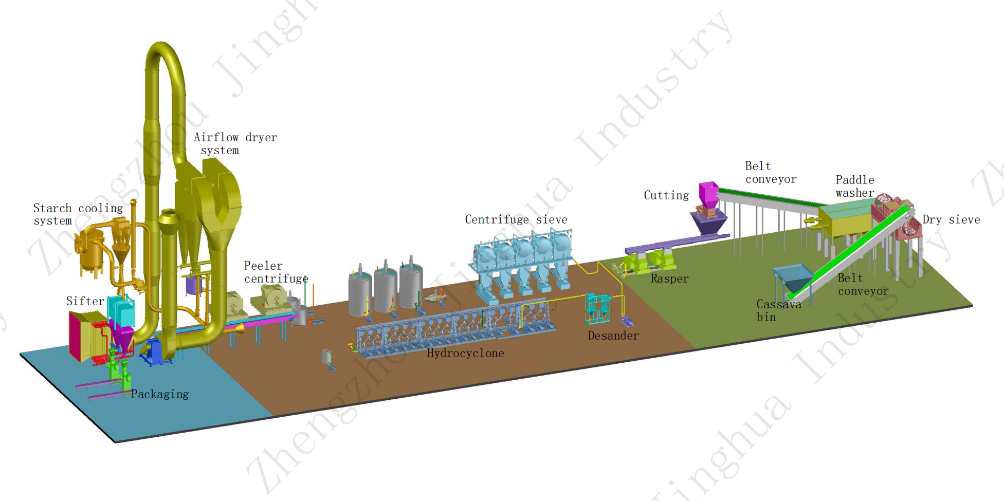 Sweet potato starch processing equipment is fully automatic sweet potato starch processing equipment, sweet potato starch processing equipment processing technology flow is: